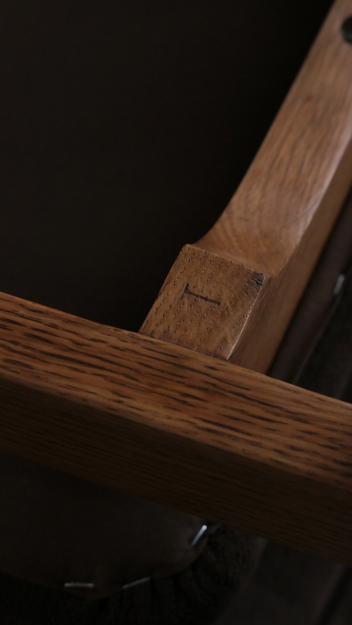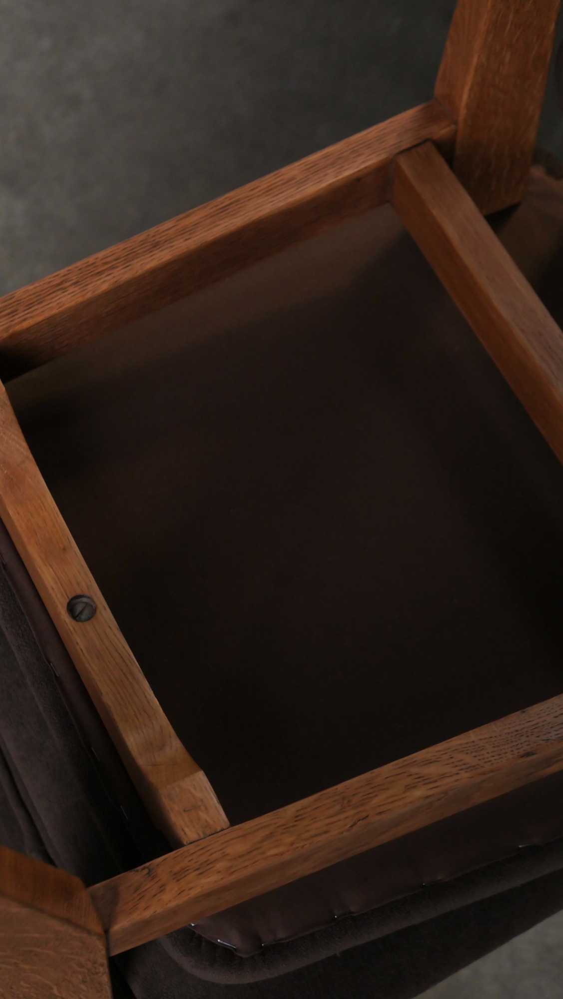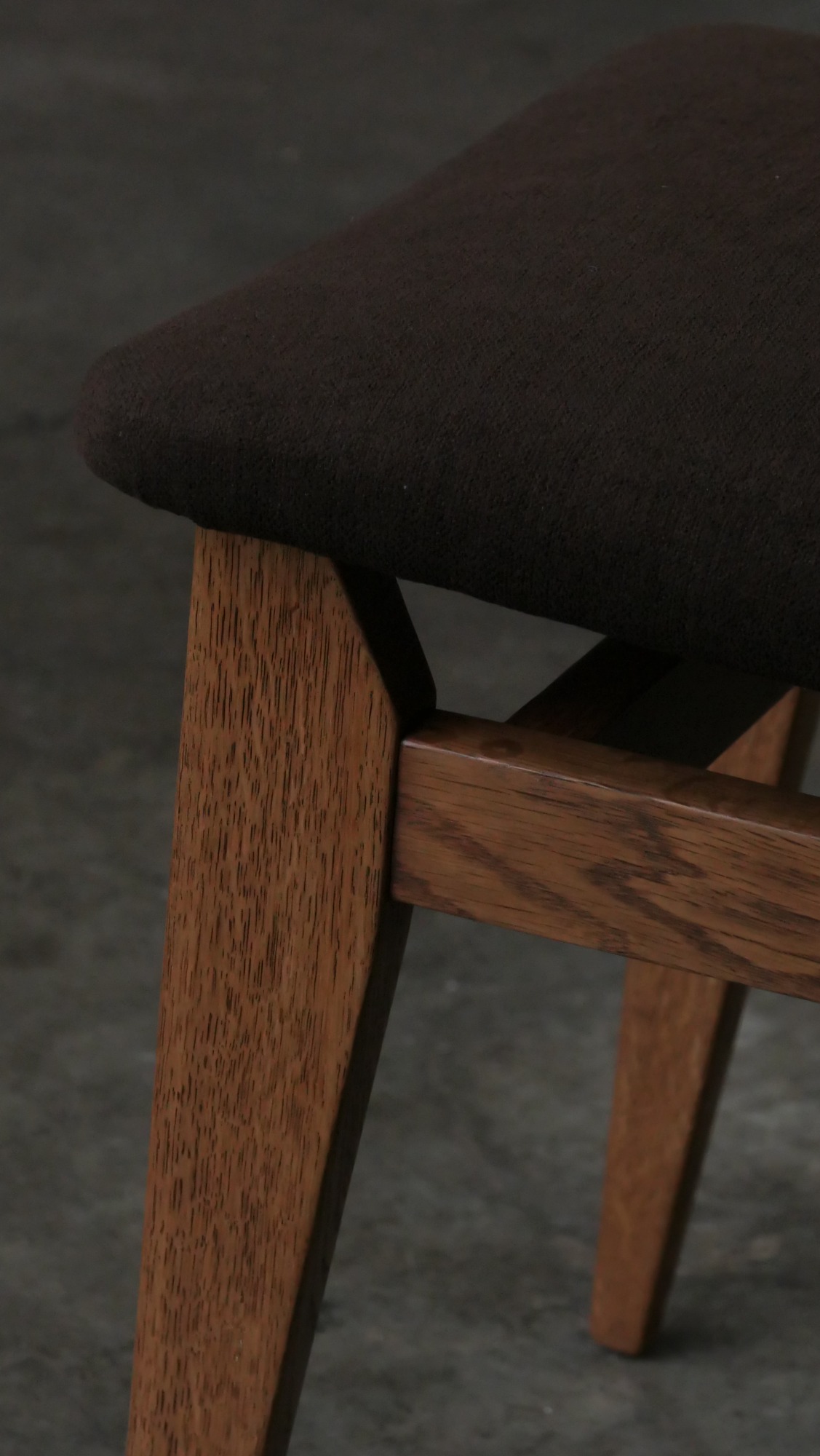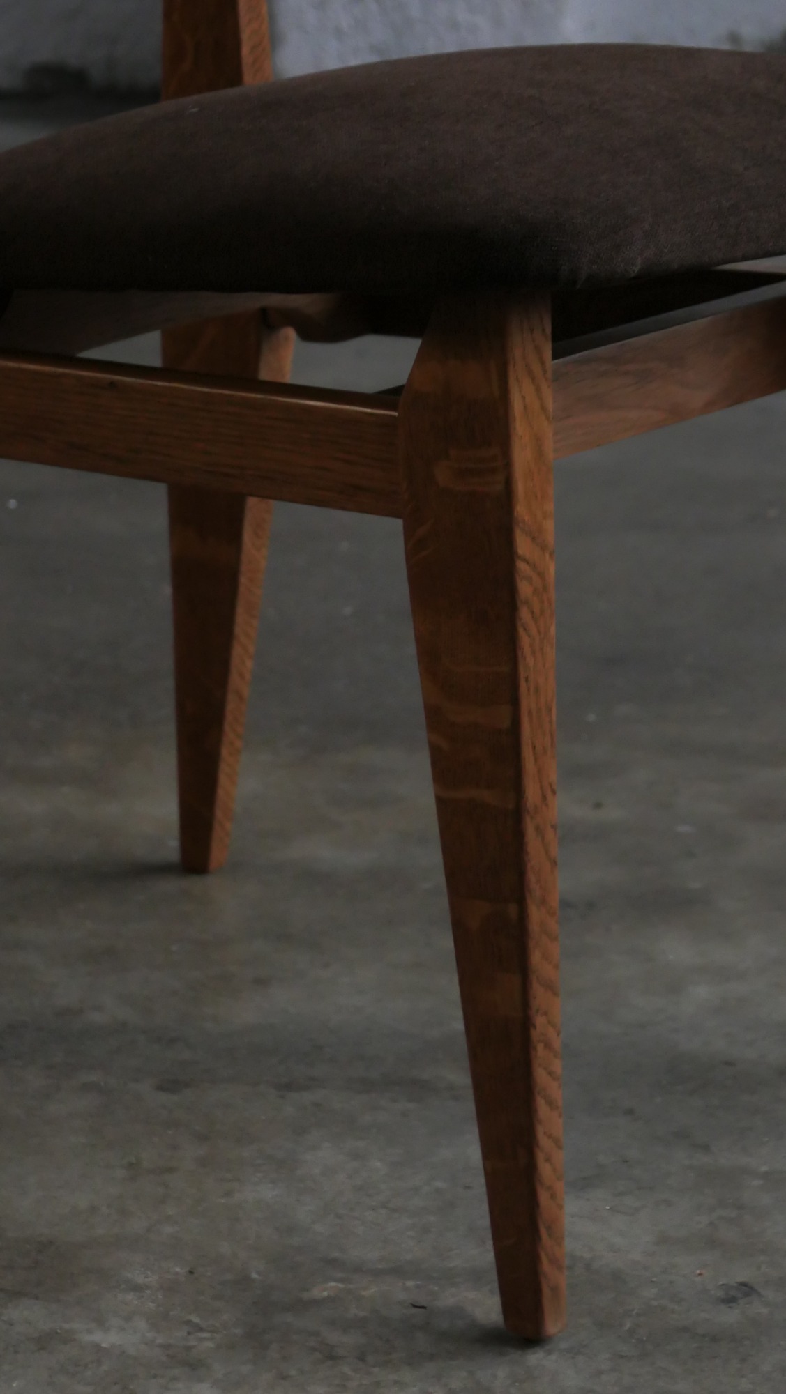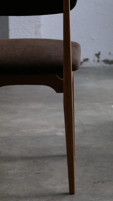 Chaque chaise a été entièrement poncée et cirée, restituant l’aspect chaleureux du chêne et révélant la beauté naturelle du bois. L’assise et le dossier ont été regarnis à neuf tout en conservant les ressorts d’époque, garantissant confort et fidélité au siège original. Le choix d’un tissu Casal brun chocolat vient souligner la sobriété élégante du modèle, créant un contraste discret et raffiné avec la structure en chêne. L’ensemble est en excellent état, sans aucune casse, ce qui est particulièrement rare pour des pièces de cette période, d’autant plus lorsqu’elles se présentent en suite de six.