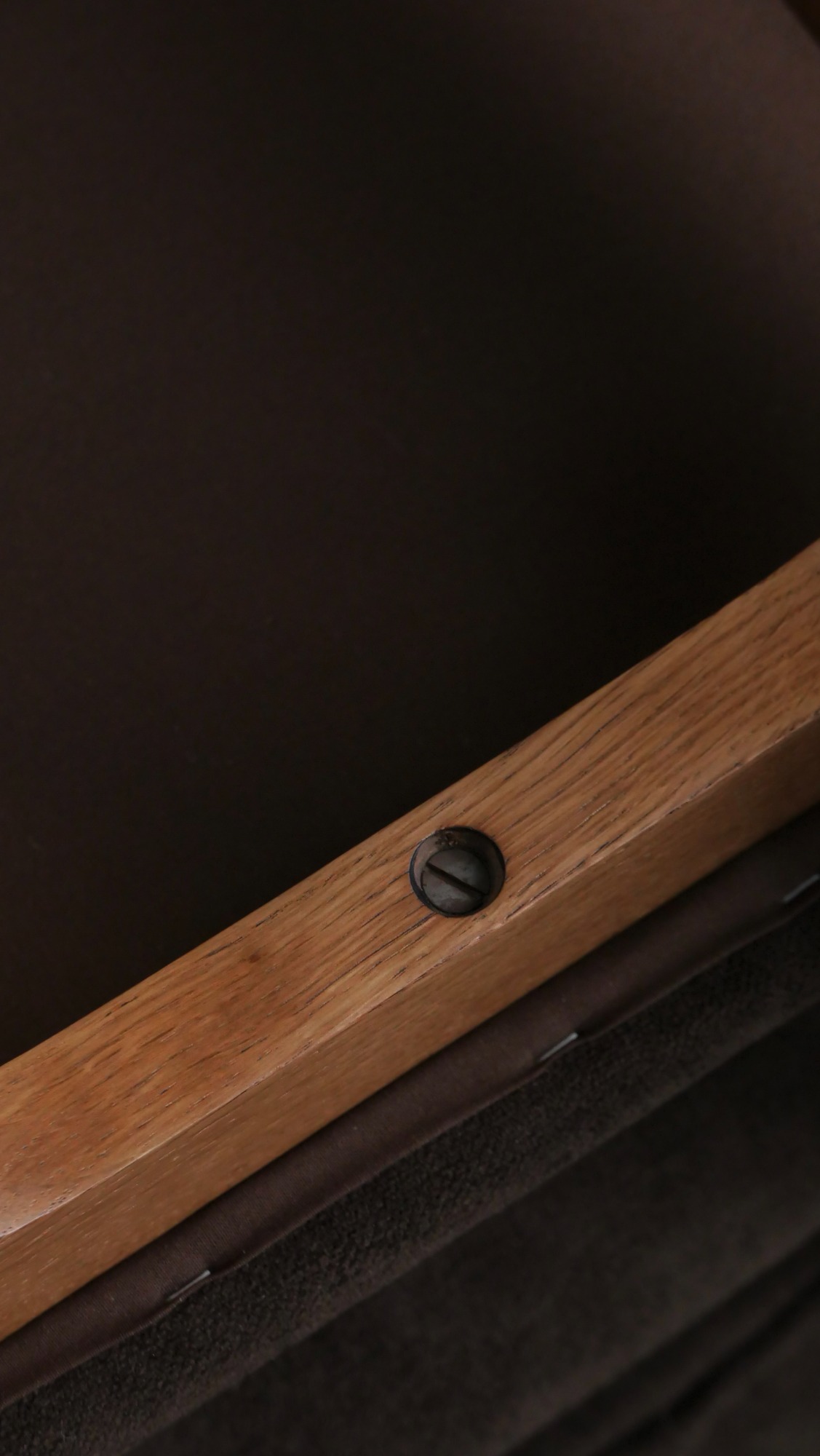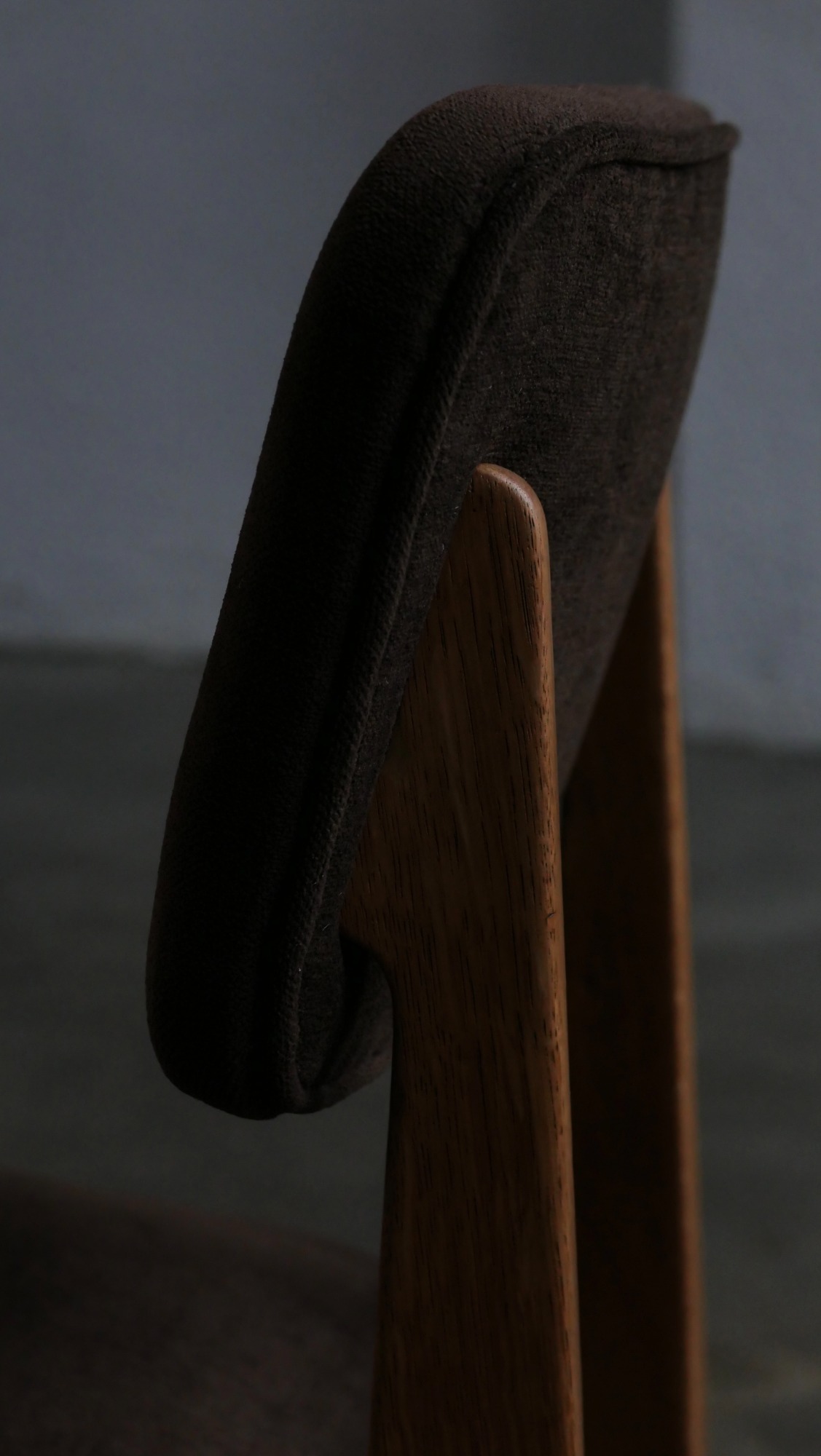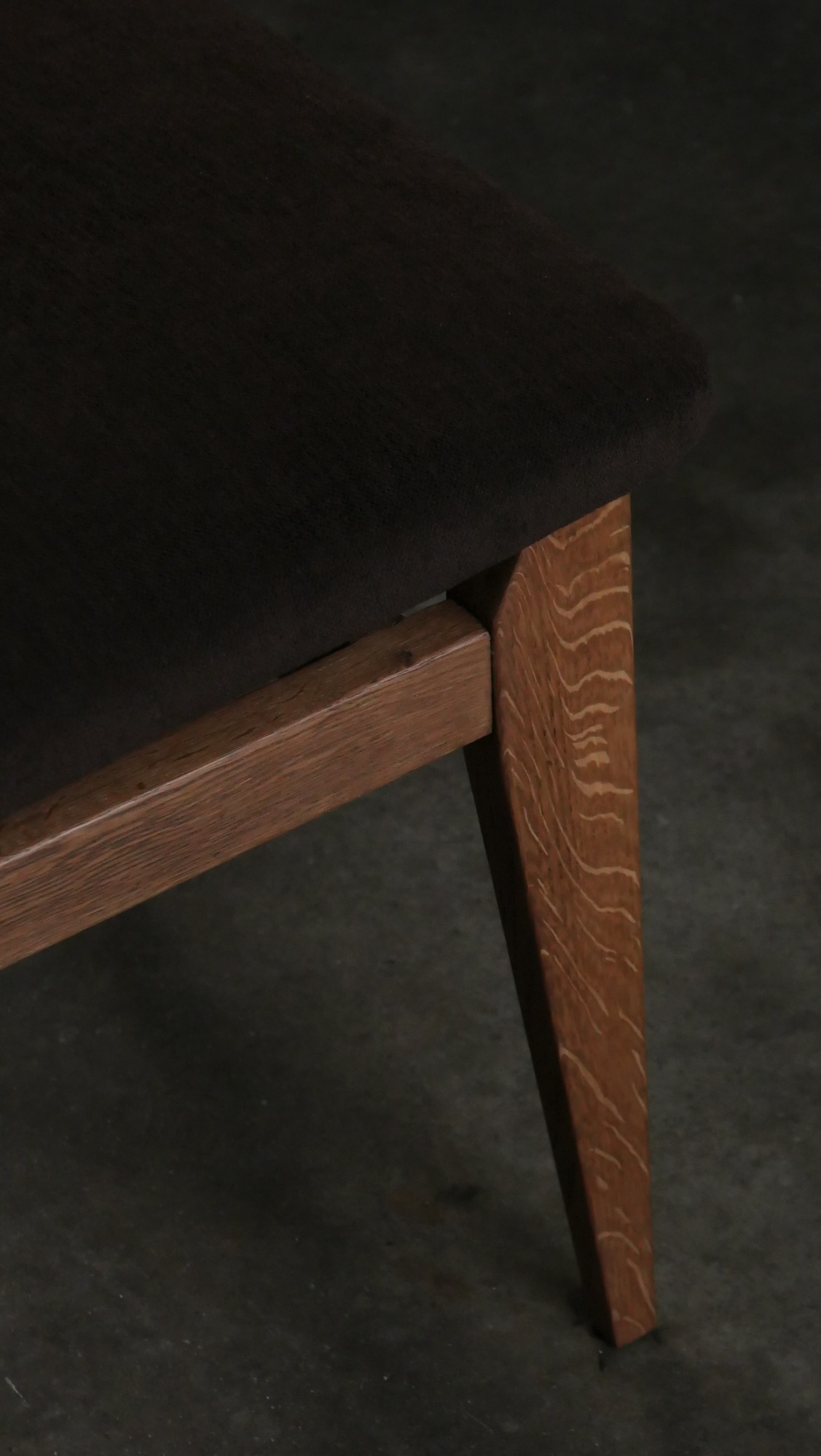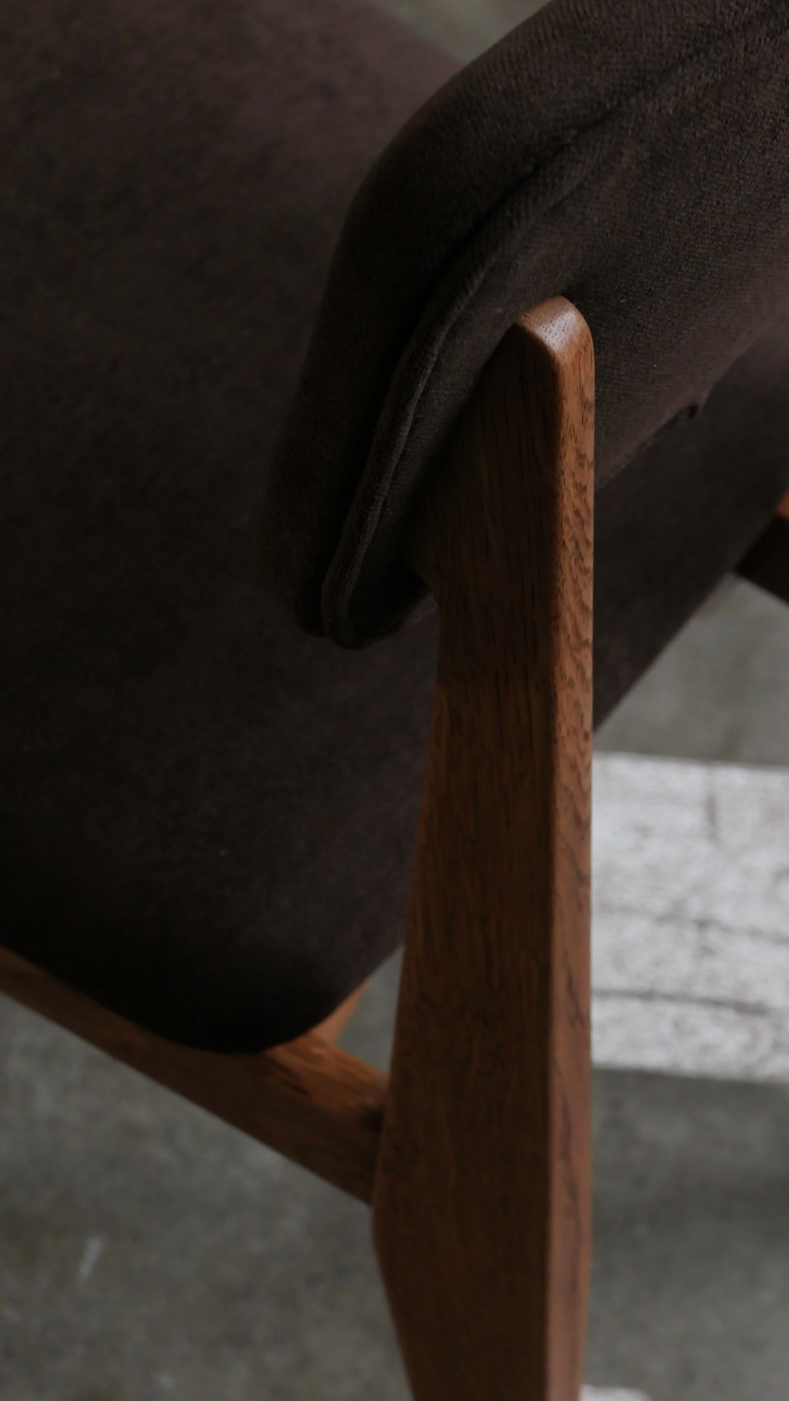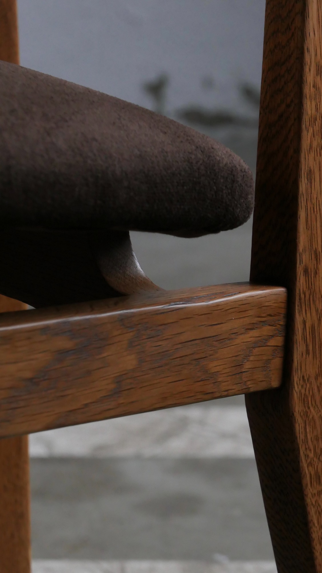 Chaque chaise a été entièrement poncée et cirée, restituant l’aspect chaleureux du chêne et révélant la beauté naturelle du bois. L’assise et le dossier ont été regarnis à neuf tout en conservant les ressorts d’époque, garantissant confort et fidélité au siège original. Le choix d’un tissu Casal brun chocolat vient souligner la sobriété élégante du modèle, créant un contraste discret et raffiné avec la structure en chêne. L’ensemble est en excellent état, sans aucune casse, ce qui est particulièrement rare pour des pièces de cette période, d’autant plus lorsqu’elles se présentent en suite de six.