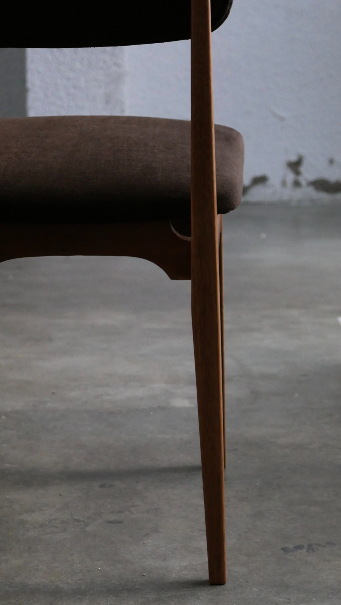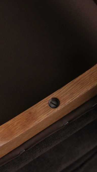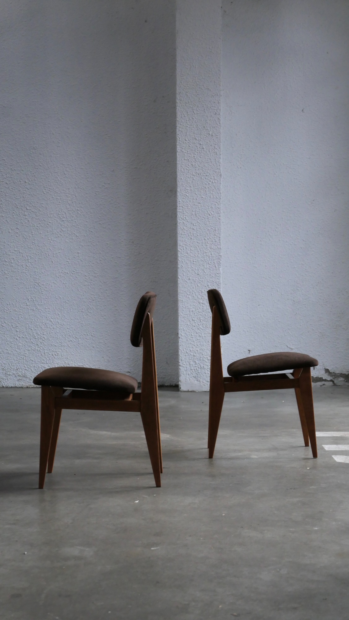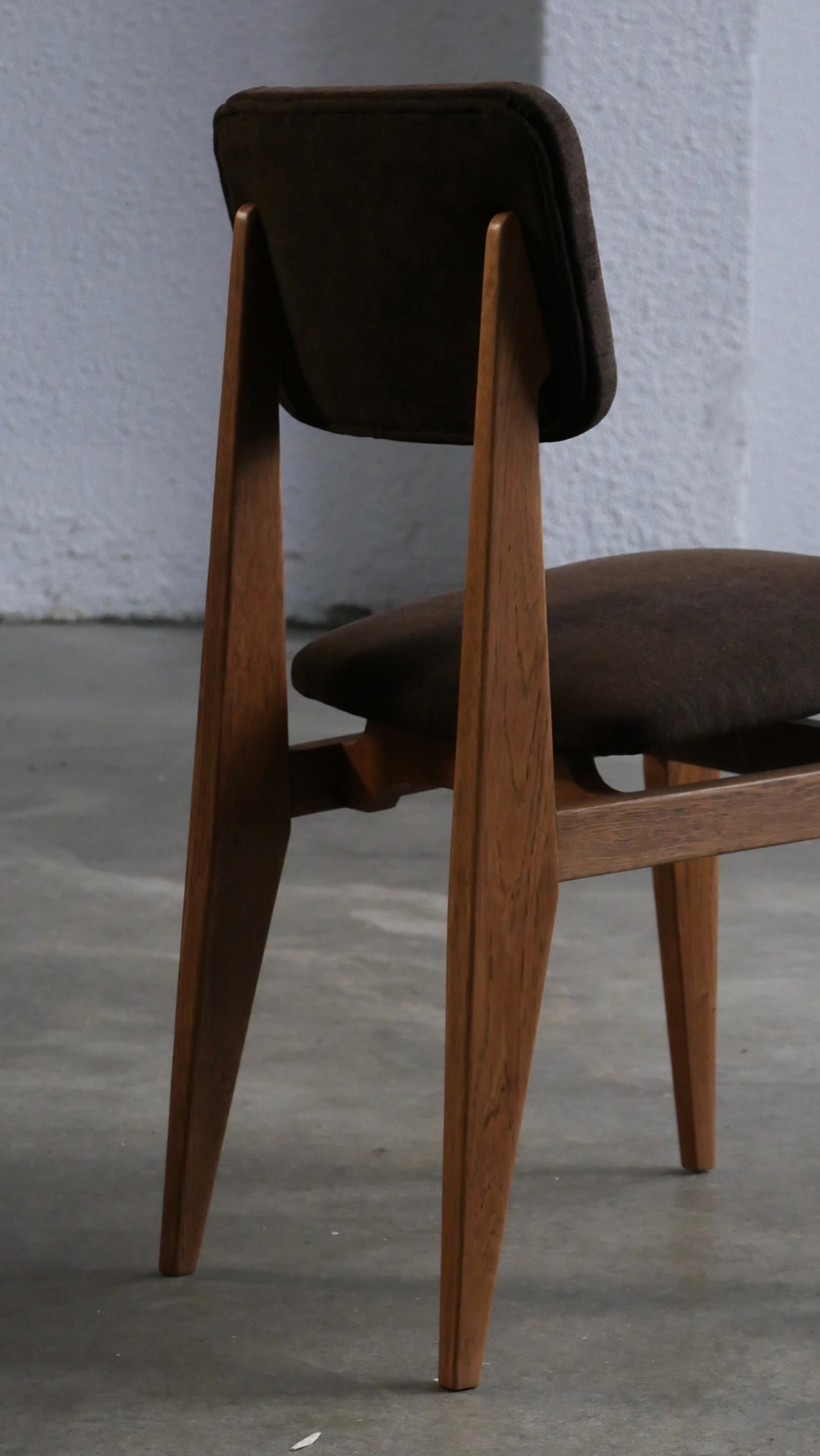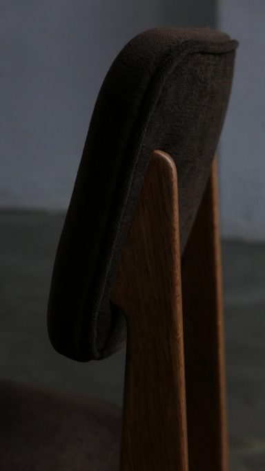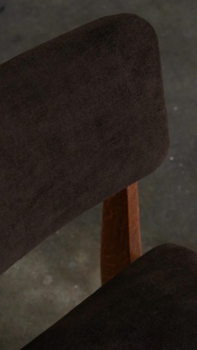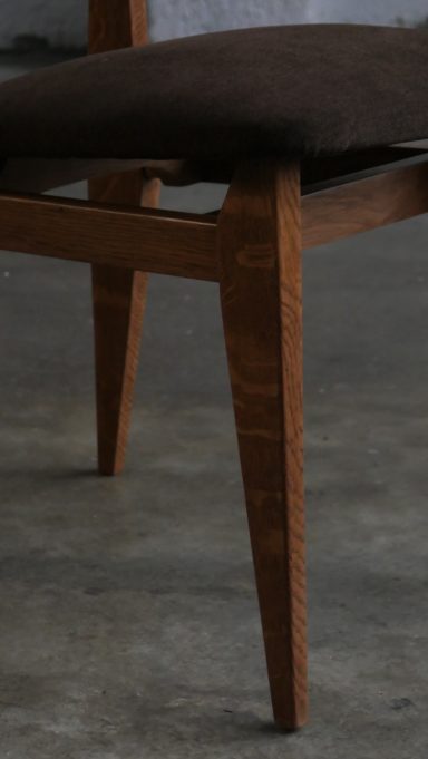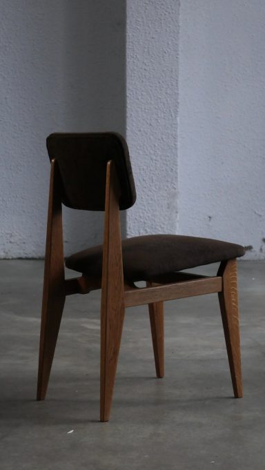 Le modèle CA appartient à une famille de chaises conçues par Gascoin pour répondre à des besoins variés et à des budgets différents. Il existe ainsi en version contreplaqué, en version cannée, en version paillée (réalisable sur demande à l’époque) et en version garnie comme celle présentée ici. À l’époque, cette version garnie représentait l’option la plus chic: plus confortable, plus chaleureuse et dotée d’une présence visuelle plus affirmée que les variantes plus sobres ou plus économiques.