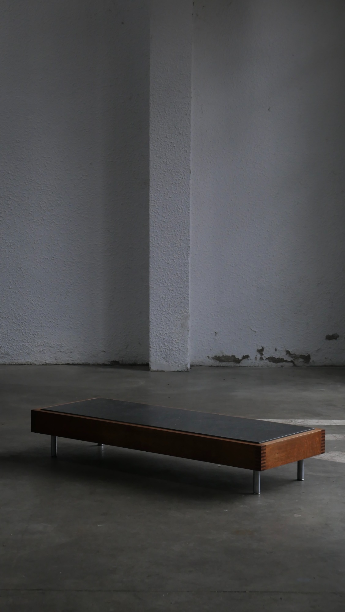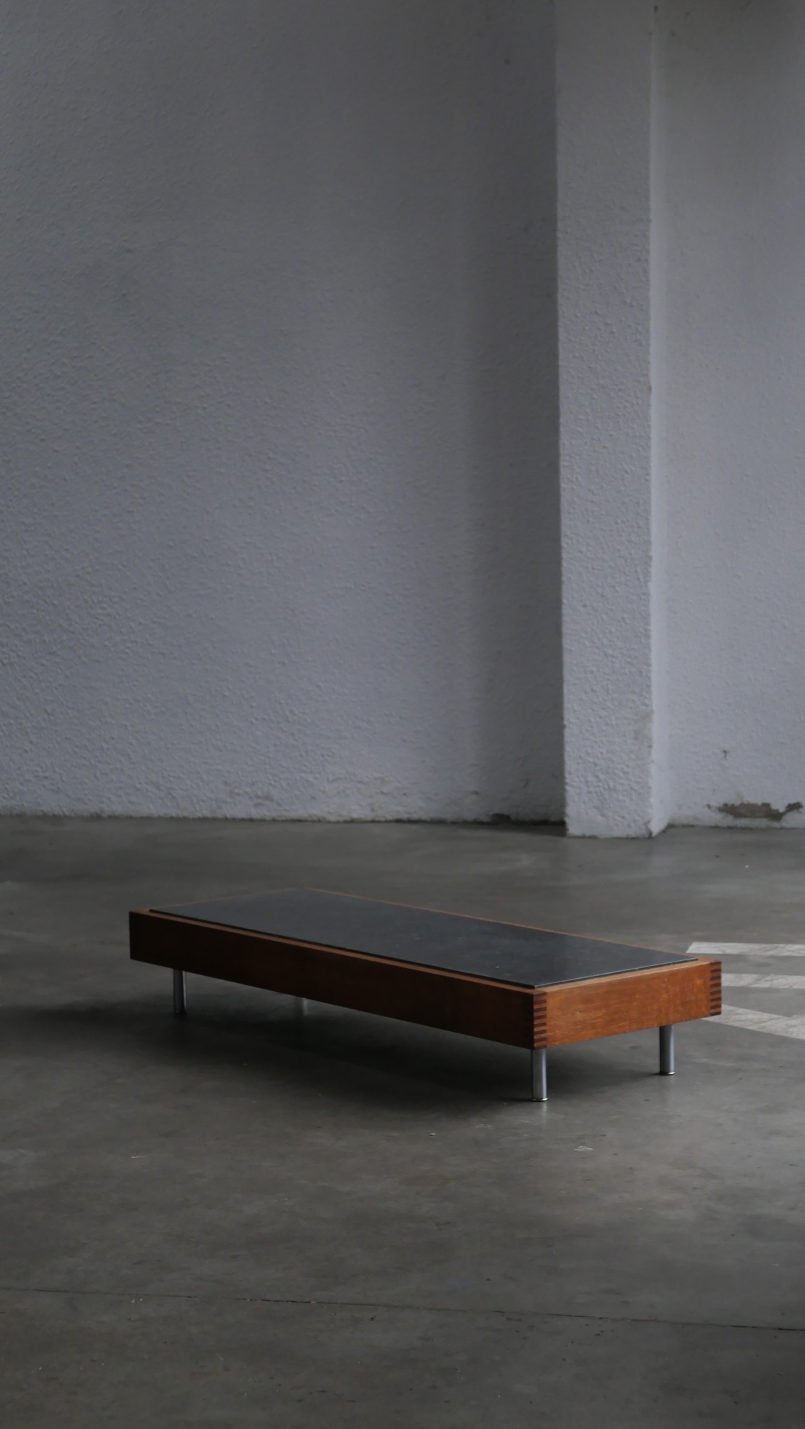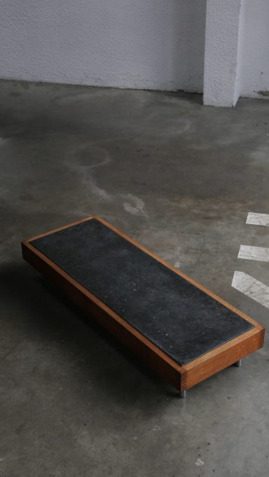 Avec son profil très bas, la table adopte une présence qui évoque subtilement un esprit japonisant : lignes sobres, équilibre visuel calme, matériaux bruts laissés dans leur authenticité.