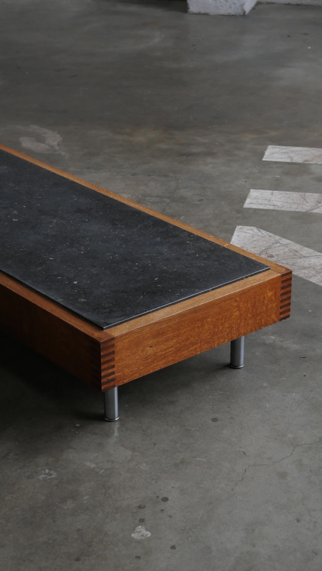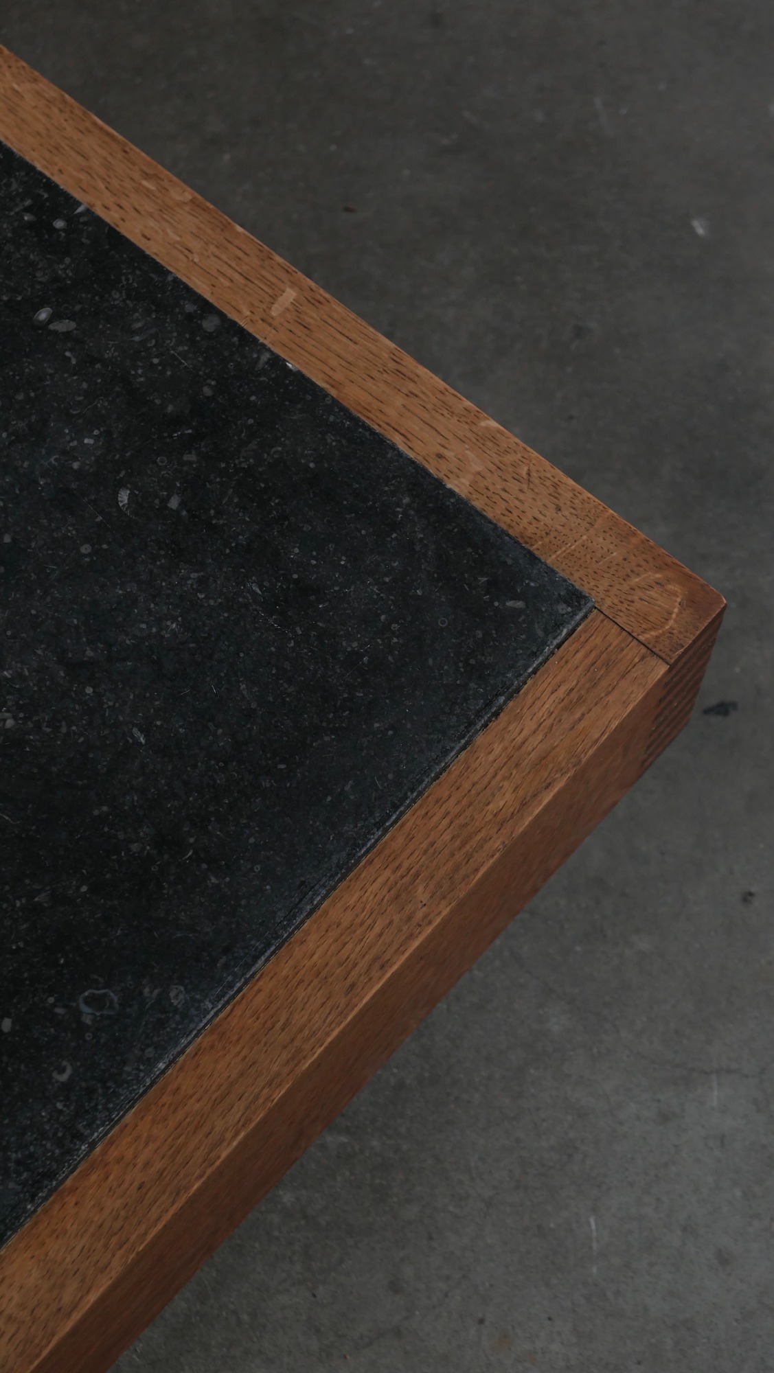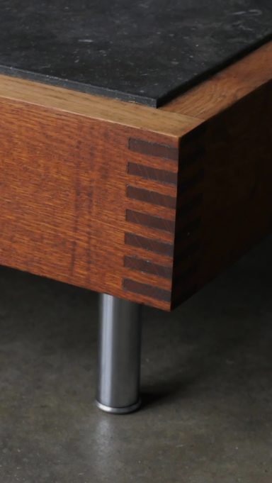 Le cadre en chêne, volontairement épais et robuste, ancre la table dans une esthétique brutaliste douce, tandis que les assemblages à queues droites révèlent un véritable travail d’ébénisterie, caractéristique du savoir-faire flamand de cette période.