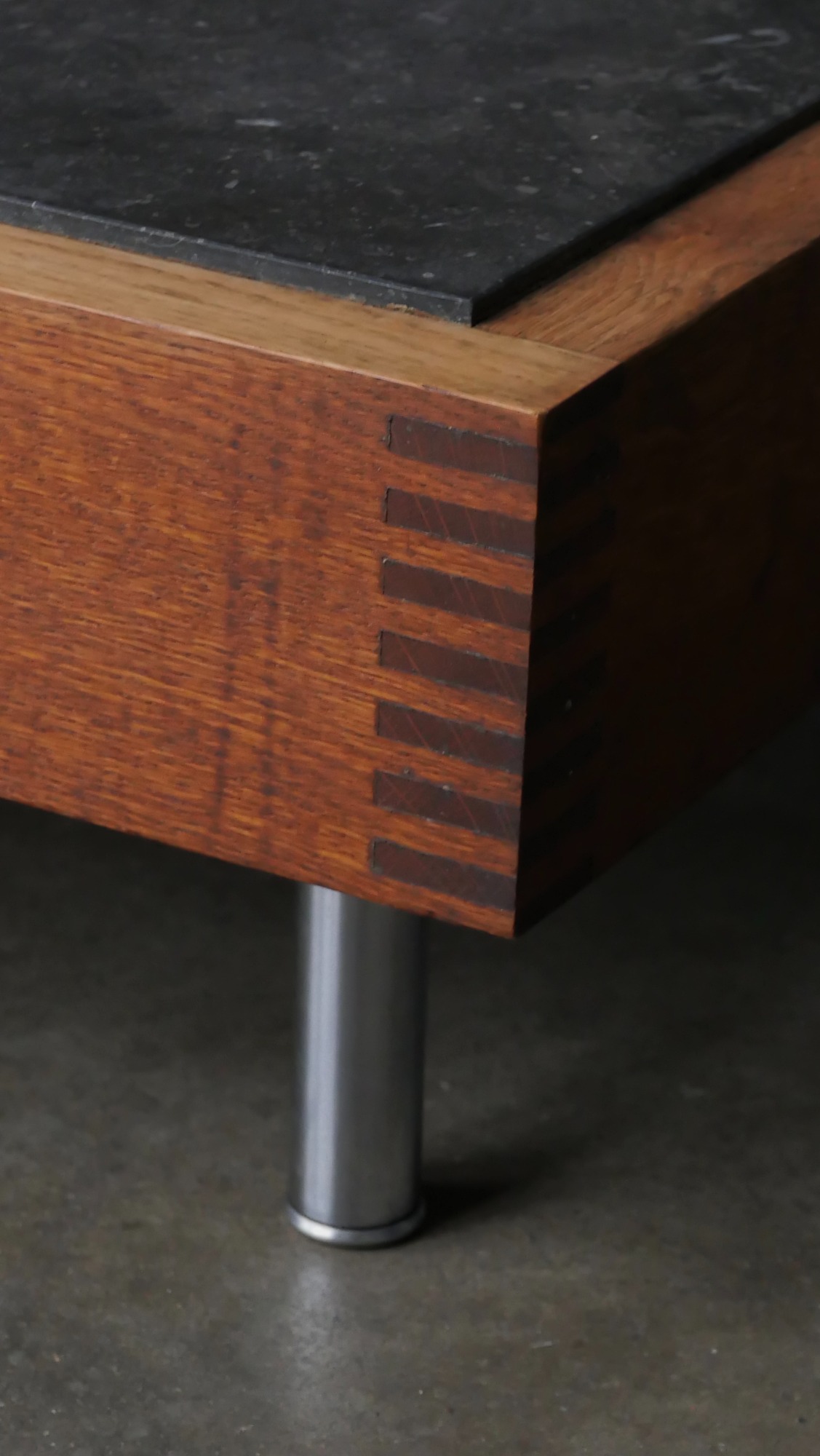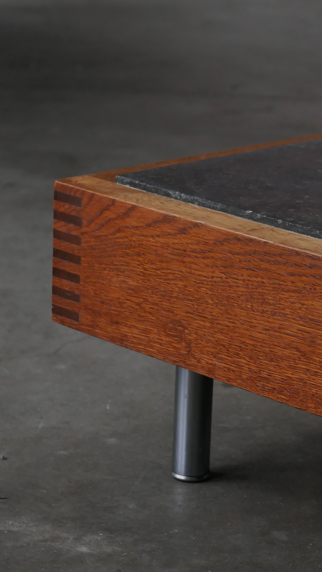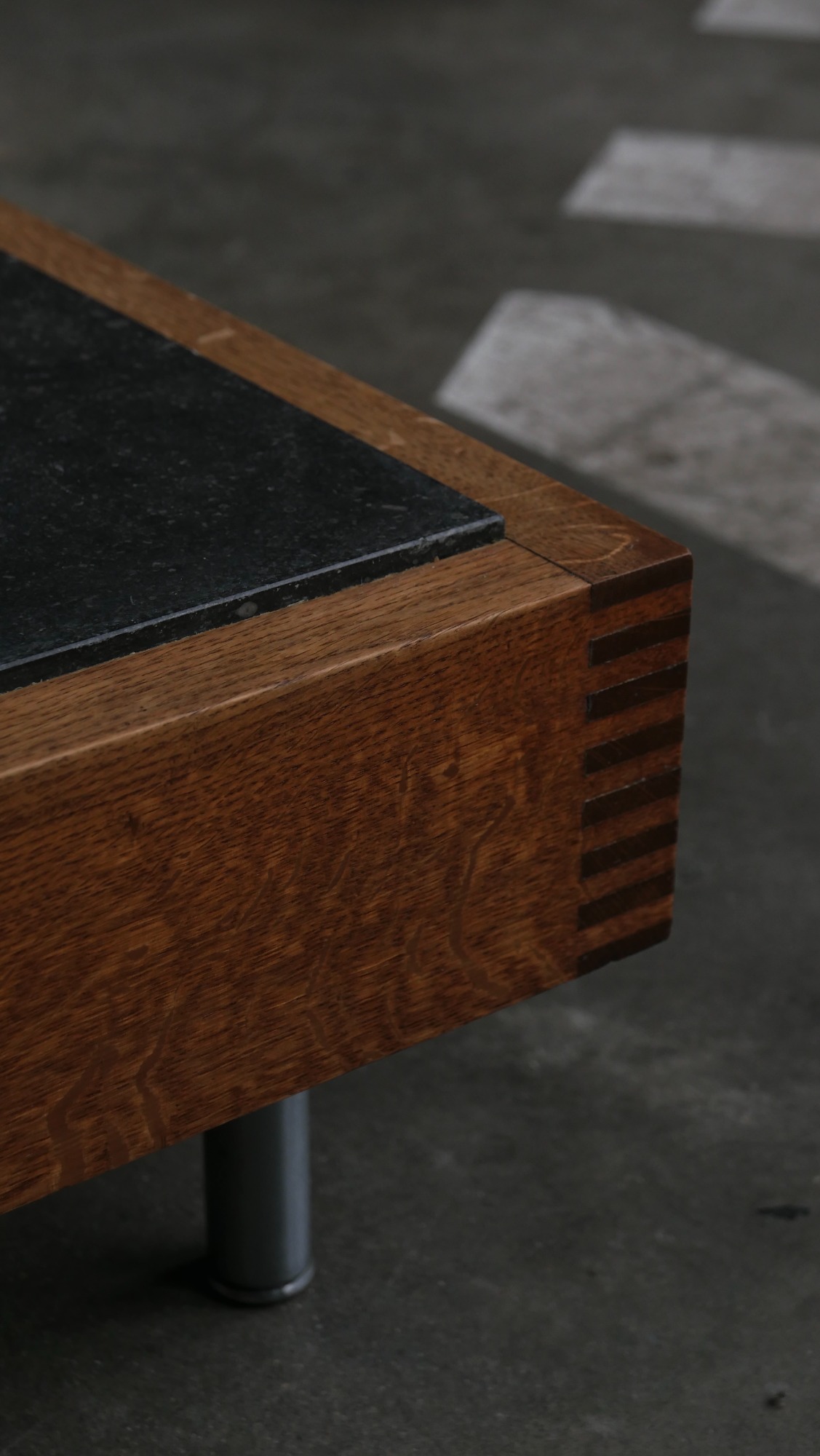Le cadre en chêne, volontairement épais et robuste, ancre la table dans une esthétique brutaliste douce, tandis que les assemblages à queues droites révèlent un véritable travail d’ébénisterie, caractéristique du savoir-faire flamand de cette période.