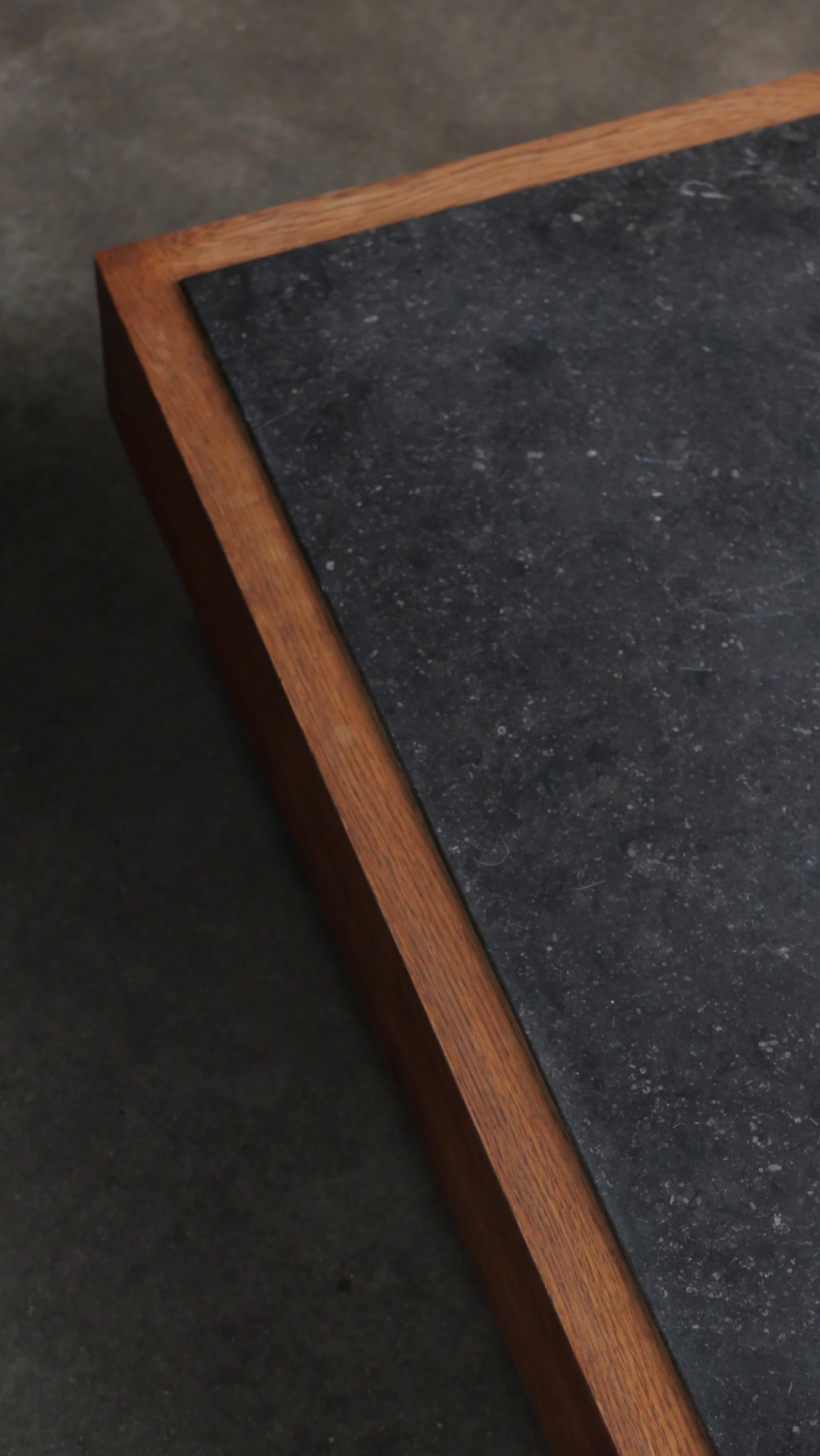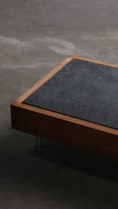 Superbe table basse belge des années 1980, réalisée dans une association de matériaux nobles : un plateau en pierre bleue de Belgique, dense et minérale, reposant sur un cadre en chêne massif au caractère affirmé.
