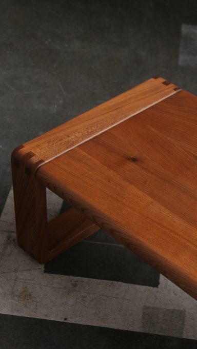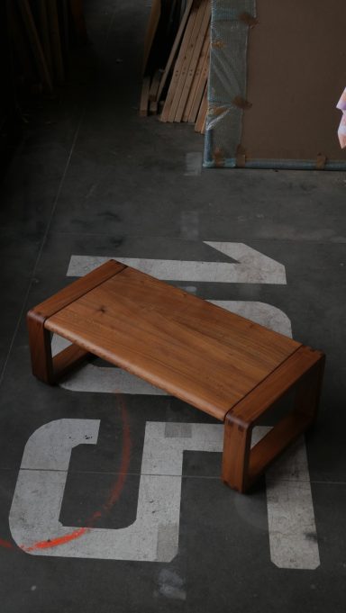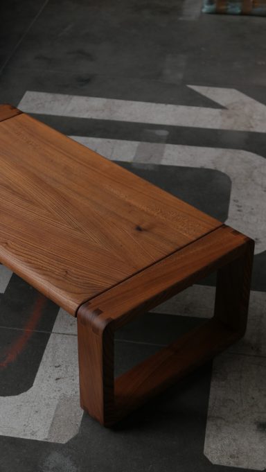 Superbe table basse en orme massif, création du designer et ébéniste français Michel Milleret, éditée par la Galerie L’Orme à Paris fin des années 1970, début des années 1980.