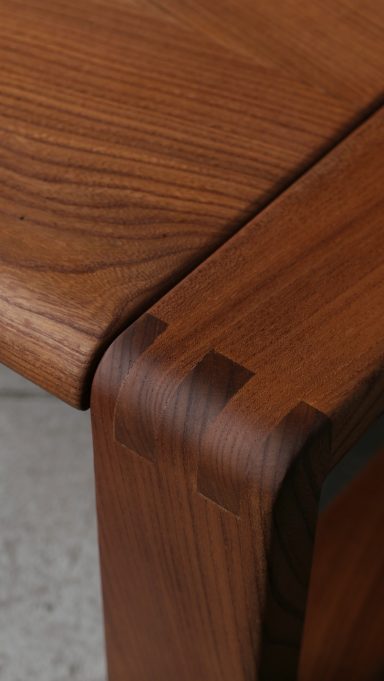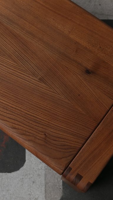 Réalisée en orme, essence rare naturellement résistante et aujourd’hui difficile à trouver sous cette forme massive, cette table illustre la volonté de certains créateurs français de la période dont Michel Milleret, de renouer avec une approche sincère et durable du mobilier, dans la droite ligne du modernisme français incarné également par Pierre Chapo.