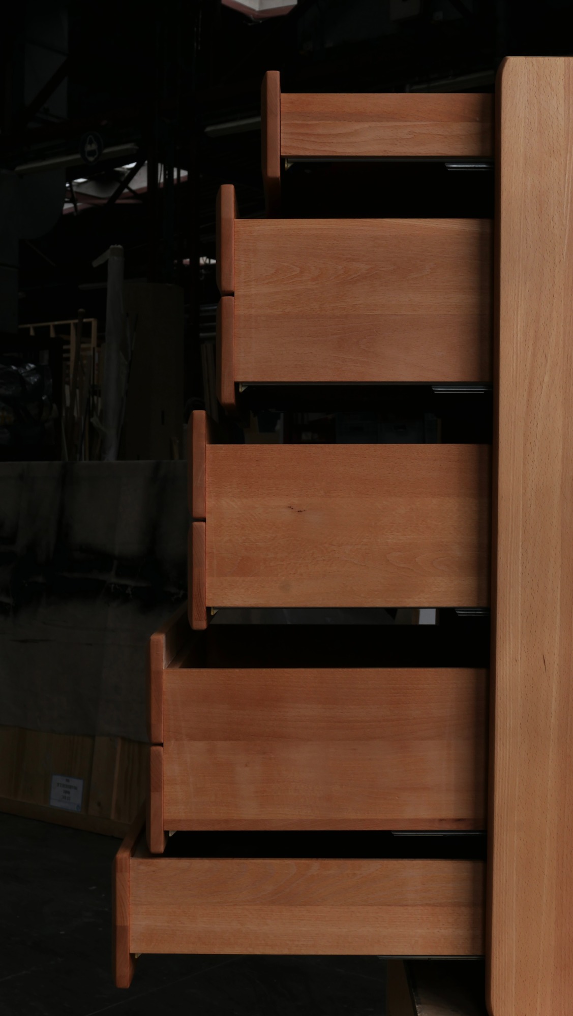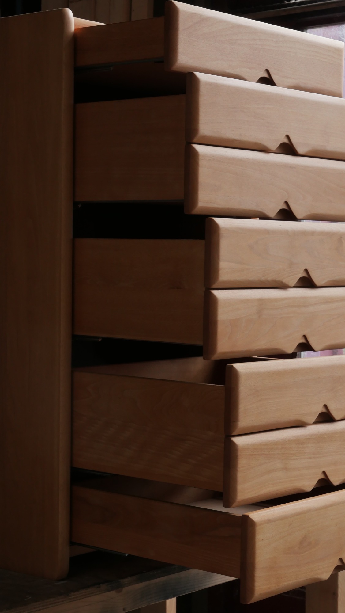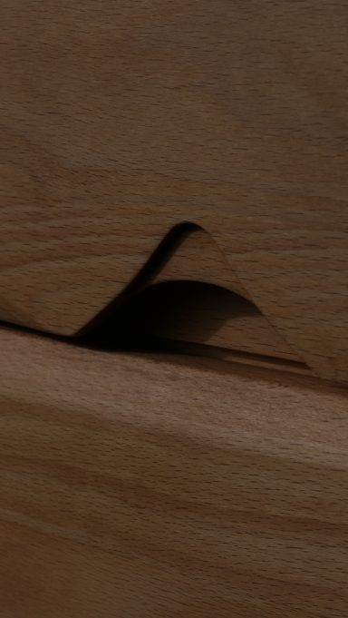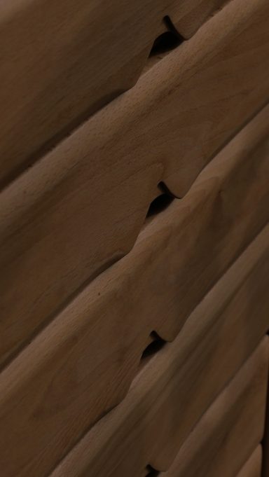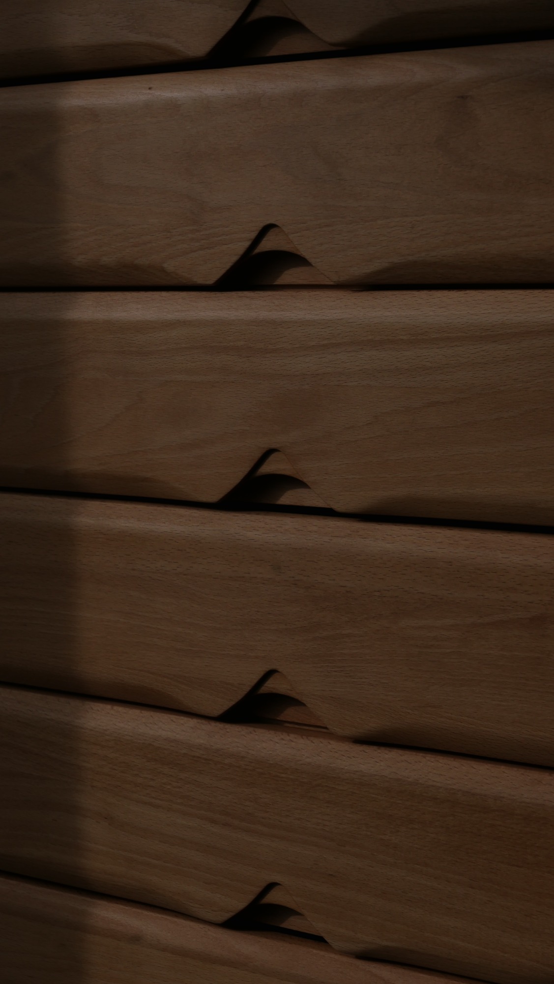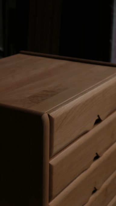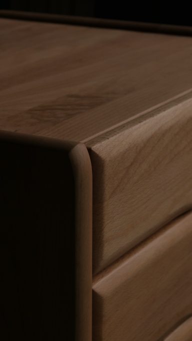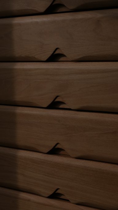 Les montants latéraux pleins, aux arêtes subtilement adoucies, encadrent une façade rythmée par des poignées sculptées directement dans la masse — un travail précis, durable et élégant.